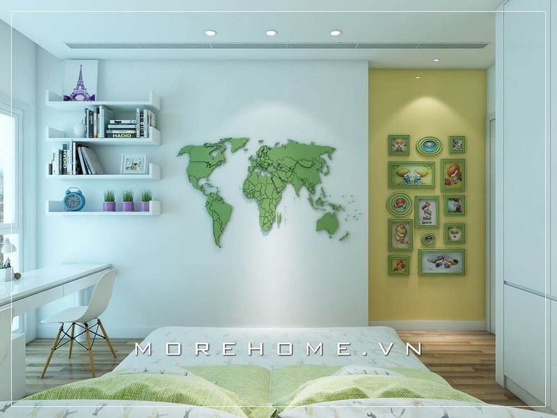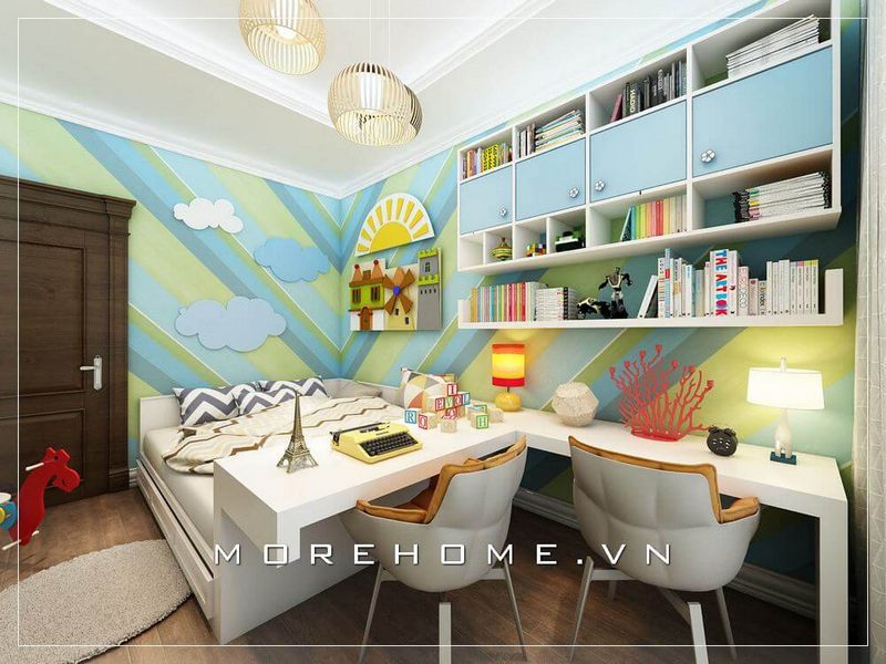 Kệ trang trí phòng ngủ với nhiều ngăn giúp góc học tập của con được tiện lợi hơn