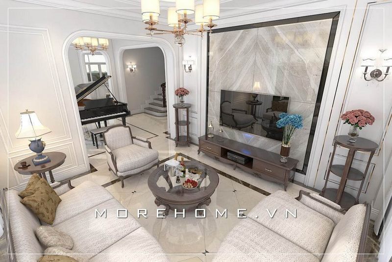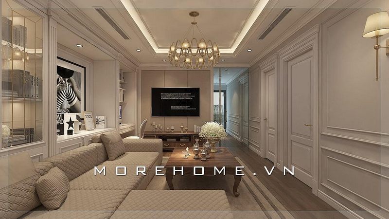 Thiết kế nội thất phòng khách chung cư cao cấp phong cách tân cổ điển sang trọng với từng đường nét, họa tiết vô cùng độc đáo