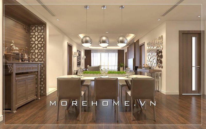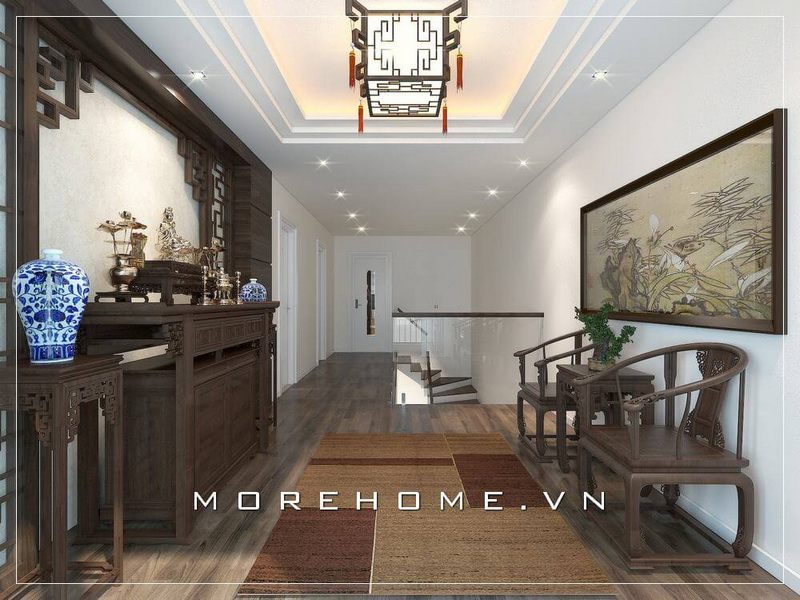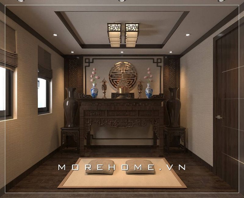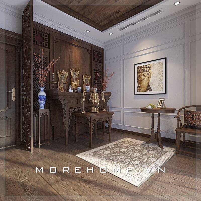 Mang đến không gian thờ cúng cho nhà phố sang trọng với mẫu bàn thờ gỗ hiện đại kết hợp nội thất cùng tông màu nâu trầm tạo sự sang trọng và lôi cuốn