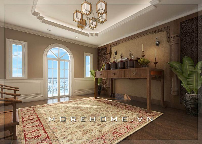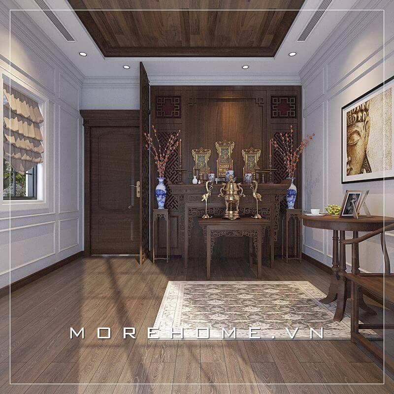 Mẫu thiết kế phòng thờ biệt thự đẹp với mẫu bàn thờ gỗ hiện đại kết hợp bộ bàn ghế gỗ cao cấp, cùng bức tranh ấn tượng mang đến không gian thờ cúng lí tưởng