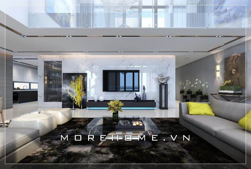 Trang trí nội thất phòng khách đẹp hiện đại chú trọng sử dụng các khối hình đơn giản giúp tiết kiệm tối đa diện tích sử dụng cho trang trí mà không làm ảnh hưởng đến tính thẩm mỹ của căn biệt thự