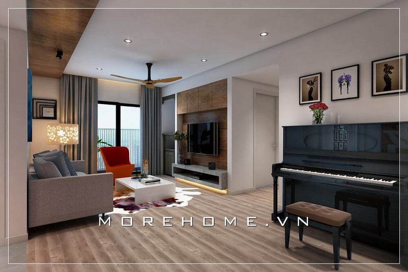 Trang trí nội thất phòng khách hiện đại có đàn piano đẹp cho căn hộ chung cư.