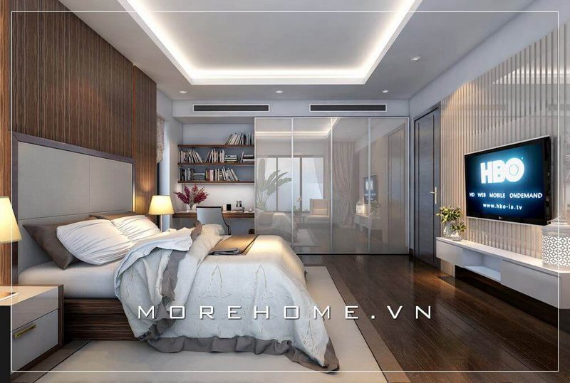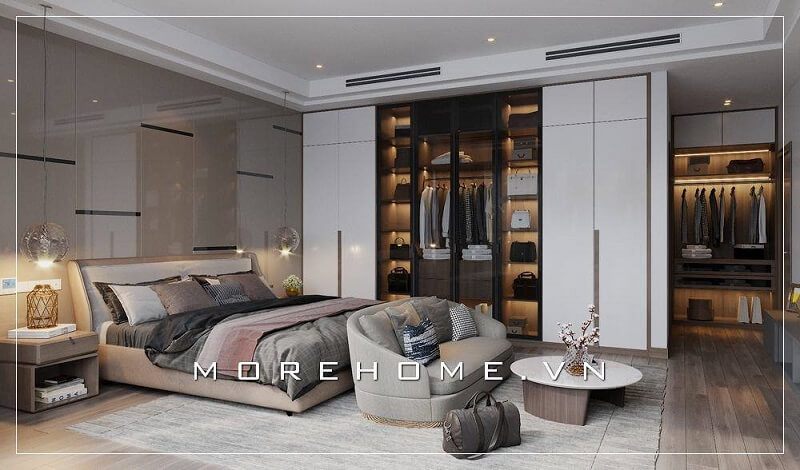 Tạo ra một không gian nghỉ ngơi thư giãn lí tưởng với một mẫu thiết kế phòng ngủ hiện đại, cách bố trí nội thất hợp lí và tông màu kết hợp hài hòa.