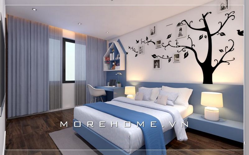 Mẫu giường ngủ gỗ công nghiệp màu xanh sẽ làm nổi bật phòng ngủ của bé trai.