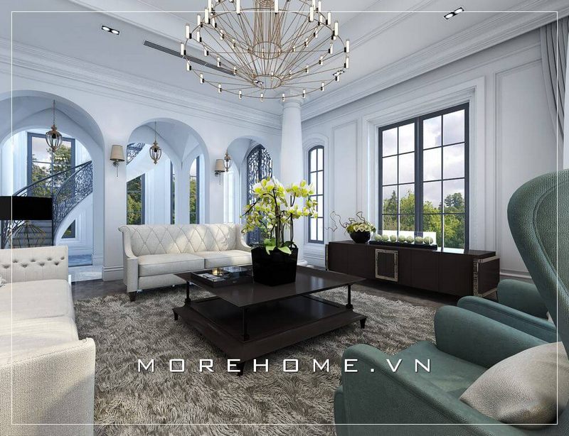 Phòng khách biệt thự, nhà phố được nhấn mạnh bởi bộ sofa tân cổ điển có kiểu dáng văng tiện nghi và vỏ bọc vải màu trắng tinh tế.